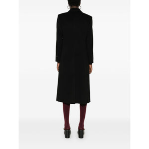 black virgin wool front button fastening peak lapels shoulder pads long sleeves buttoned cuffs chest welt pocket two side flap pockets central rear vent logo-jacquard lining straight hem mid-length Wool single-breasted coat Size and Fit - This piece fits true to size. We recommend you get your regular size. Model is 1,75m / 5ft 8in wearing size 40 (IT)