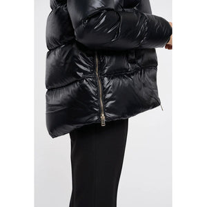 People Of Shibuya quilted down jacket in ultralight technical fabric with ‘pearl finish’ treatment. 90/10 goose down filling. Central double-slider die-cast zip with gold finish and new round logo. Bellows side openings with metal-effect die-cast zips. External welt pockets with invisible magnet button. Inner cuff in thermal lycra for greater protection from external weather and thermal performance. Logo applied in 3D lycra in colour tone. High-visibility reflective details.