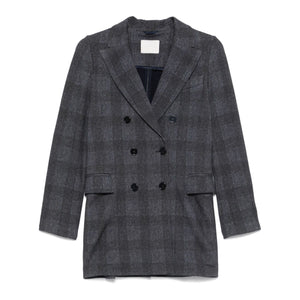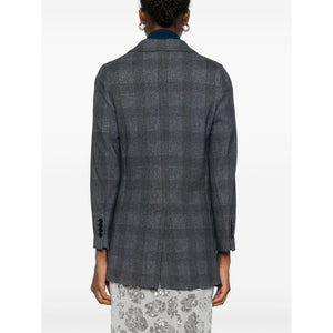 navy blue/charcoal grey cotton blend double-breasted button fastening check pattern peak lapels long sleeves buttoned cuffs chest welt pocket two front flap pockets American rear vent partial lining straight hem Cotton double-breasted jacket Size and Fit - This piece fits true to size. We recommend you get your regular size. Model is 1,75m / 5ft 8in wearing size 40 (IT)