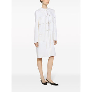 white tweed frayed edge crew neck concealed front fastening long sleeves four front patch pockets knee-length straight hem Wool tweed coat Size and Fit - This piece fits true to size. We recommend you get your regular size. Model is 1,75m / 5ft 8in wearing size 40 (IT)