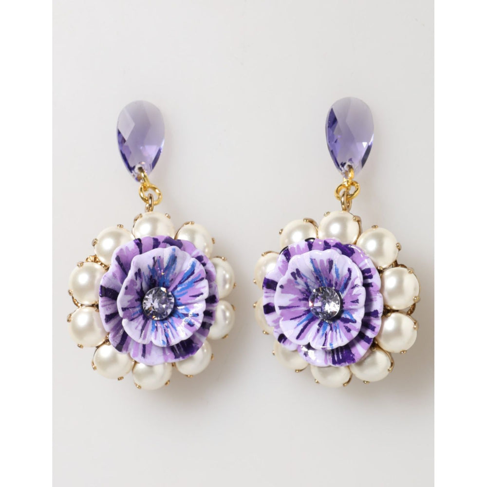 • Dolce & Gabbana Purple Floral Crystal Pearl Drop Clip-On Statement Earrings with enamel flower and pearls.