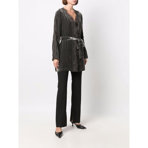 Dark grey lace-trim belted coat from GOLD HAWK featuring lace trim, V-neck, long sleeves, tied waist and two side slit pockets. Velvet long duster Size and Fit - This piece fits true to size. We recommend you get your regular size. Model is 1,75m / 5ft 8in wearing size S