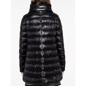 black shell down-feather filling padded design quilted logo plaque stand-up collar concealed front press-stud fastening long sleeves two side zip-fastening pockets high-low hem full lining Ameli midi down jacket Size and Fit - SLEEVE LENGTH: 85.0 Centimetres. LENGTH: 84.0 Centimetres. WAIST: 108.0 Centimetres. BUST: 102.0 Centimetres.