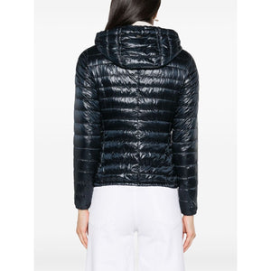 navy blue feather down padded design quilted gold-tone logo plaque logo-engraved gold-tone hardware detachable drawstring hood front two-way zip fastening long sleeves elasticated cuffs two side zip-fastening pockets elasticated hem quilted lining Nylon short down jacket Size and Fit - This piece fits true to size. We recommend you get your regular size. Model is 1,75m / 5ft 8in wearing size 40 (IT)